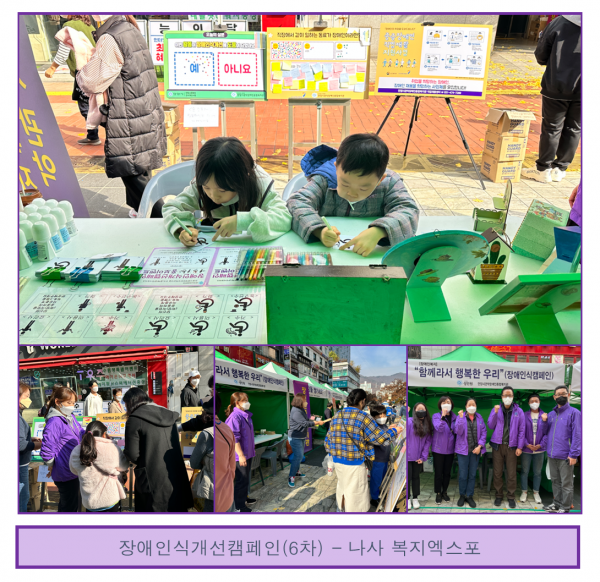 2022년 11월 11일(금) ~ 12(토) 양일간 산본로데오 거리에서 진행된 나사복지엑스포에 장애인식개선캠페인 활동으로 참여하였습니다.