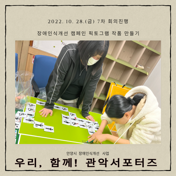 목록 우리,함께! 관악서포터즈 7차회의 진행 페이지 정보 운영자 조회 1,114 입력 2022-10-31 11:51 댓글 0 본문 2022년 10월 28일(금) 우리,함께! 관악서포터즈 7차회의를 진행했습니다.지난 장애인식개선 캠페인에서 수집된 160개의 직업 픽토그램을 하나의 작품으로 만들고자 단원들이 모였습니다!!11월 중 다양한 직업 픽토그램 작품을 완성하여 선보일예정입니다. 완성된 작품과 함께 찾아올게요~!감사합니다. 목록 이전글2022년 활동지원사 전체 워크샵 2022.10.31 다음글2022년 5차 취업자동아리 2022.10.31 댓글 0 댓글목록 등록된 댓글이 없습니다.