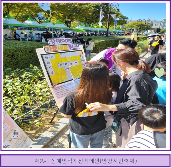 이번 장애인식개선캠페인은 안양시민축제에 참여한 시민과 함께 OX퀴즈, 가로세로낱말퀴즈를 통해 장애에 대해 올바른 지식과 정보를 습득할 수 있는 계기를 마련하였습니다.