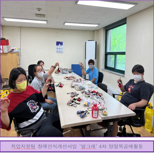 2022년 8월 1일(월) 안양시장애인식개선사업 ‘발그레’(발달장애인, 그대와 함께 레츠고)의 일환으로 공예품(키링) 만드는 방법을 배우고, 만들어보는 시간을 가졌습니다.