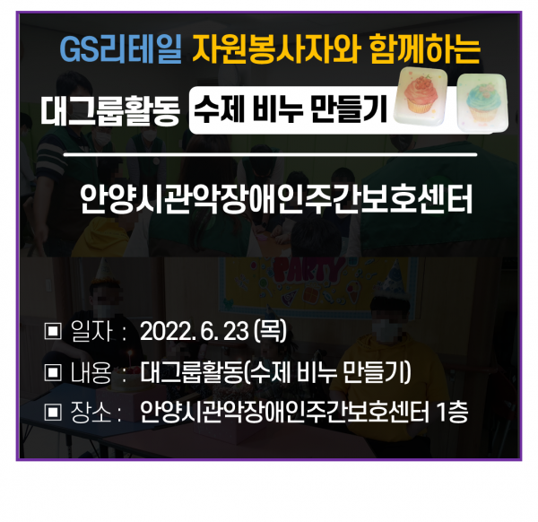 목록 관악주간보호센터 대그룹활동(수제 비누 만들기) 페이지 정보 박성배 조회 1,066 입력 2022-06-23 17:44 댓글 0 본문 안양시관악장애인주간보호센터에서는 대그룹활동으로 수제 비누 만들기 활동을 진행했습니다. GS리테일 자원봉사자 10명과 활동을 함께하였습니다. "대그룹활동"은 주간보호센터 이용자에게 예체능 프로그램 통해 다양한 경험을 제공하고 자존감을 향상하고자 합니다. 목록 이전글주간보호센터 외부체험활동 5차(의왕 백운호수) 2022.06.24 다음글안양시관악 활동지원기관 평가 2022.06.23 댓글 0 댓글목록 등록된 댓글이 없습니다.