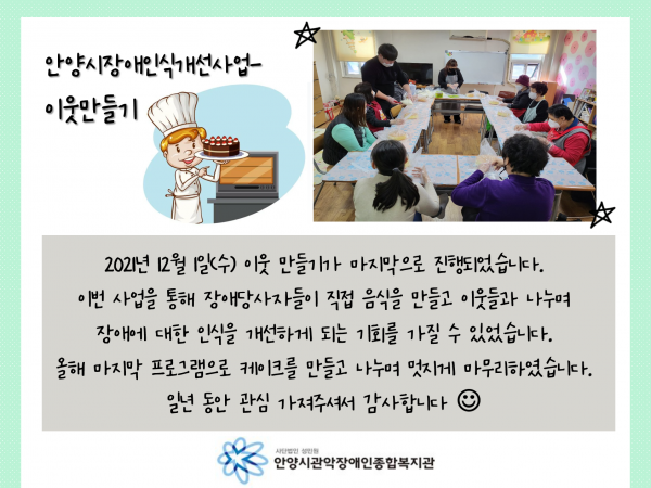목록 안양시장애인식개선사업- 이웃만들기 마무리 페이지 정보 운영자 조회 1,260 입력 2021-12-07 10:13 댓글 0 본문 목록 이전글신입장애인활동지원사교육 2021.12.16 다음글3차 자원봉사자 간담회 2021.12.07 댓글 0 댓글목록 등록된 댓글이 없습니다.