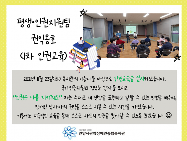 목록 평생·인권지원팀 권익옹호 (1차 인권교육) 페이지 정보 운영자 조회 1,134 입력 2021-11-23 14:40 댓글 0 본문 목록 이전글2차 자원봉사자 간담회 2021.11.23 다음글작업활동2반 5차 지역사회적응훈련 2021.11.22 댓글 0 댓글목록 등록된 댓글이 없습니다.