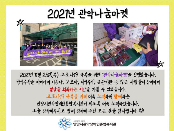 목록 2021년 관악나눔마켓 페이지 정보 운영자 조회 1,183 입력 2021-11-25 18:18 댓글 0 본문 목록 이전글2021 안양시 장애인식개선사업 손끝으로 만드는 세상 작품전시회 2021.11.30 다음글직업지원팀 3차 성교육 진행 2021.11.25 댓글 0 댓글목록 등록된 댓글이 없습니다.