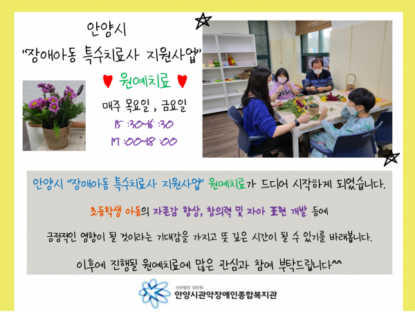 목록 안양시 “장애아동 특수치료사 지원사업” 원예치료 개시 페이지 정보 운영자 조회 1,230 입력 2021-11-09 11:52 댓글 0 본문 목록 이전글안양시장애인식개선사업 ’이웃만들기’ – 빼빼로& 마카롱 만들기, 나눔 진행 2021.11.09 다음글직원내부교육 청렴교육 2021.11.05 댓글 0 댓글목록 등록된 댓글이 없습니다.