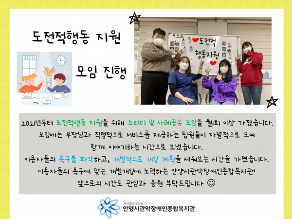 목록 도전적행동 지원 모임 진행 페이지 정보 운영자 조회 1,351 입력 2021-11-16 15:26 댓글 0 본문 목록 이전글2022년 운영사업계획회의 2021.11.18 다음글2021 안양시 장애인식개선사업 손끝으로 만드는 세상 8차 진행 2021.11.16 댓글 0 댓글목록 등록된 댓글이 없습니다.