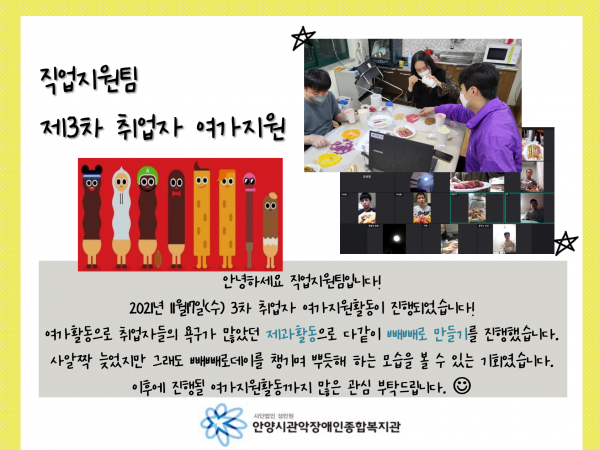 목록 직업지원팀 제3차 취업자 여가지원 페이지 정보 운영자 조회 1,262 입력 2021-11-19 17:55 댓글 0 본문 목록 이전글작업활동2반 5차 지역사회적응훈련 2021.11.22 다음글2021년 안양시장애인식개선사업 ‘이웃 만들기’ 2021.11.18 댓글 0 댓글목록 등록된 댓글이 없습니다.