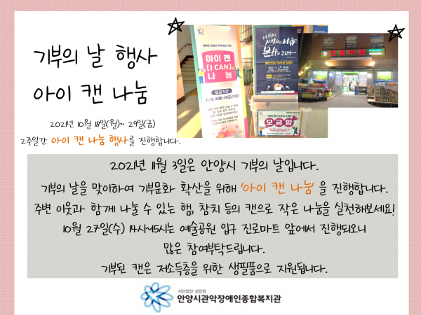 목록 기부의 날 '아이 캔(I CAN) 나눔' 행사 안내 페이지 정보 운영자 조회 1,179 입력 2021-10-22 17:21 댓글 0 본문 목록 이전글"너랑 나랑" 형제자매 관계 개선 프로그램 1차 프로그램 케이크 만들기 진행 2021.10.25 다음글가족기능강화사업-맘스터치 1차 프로그램 진행 2021.10.22 댓글 0 댓글목록 등록된 댓글이 없습니다.