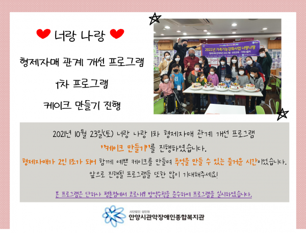 목록 "너랑 나랑" 형제자매 관계 개선 프로그램 1차 프로그램 케이크 만들기 진행 페이지 정보 운영자 조회 1,277 입력 2021-10-25 11:58 댓글 0 본문 목록 이전글10월 안양시사회복지협의회 좋은 이웃들사업 선정 및 지원 2021.10.25 다음글기부의 날 '아이 캔(I CAN) 나눔' 행사 안내 2021.10.22 댓글 0 댓글목록 등록된 댓글이 없습니다.