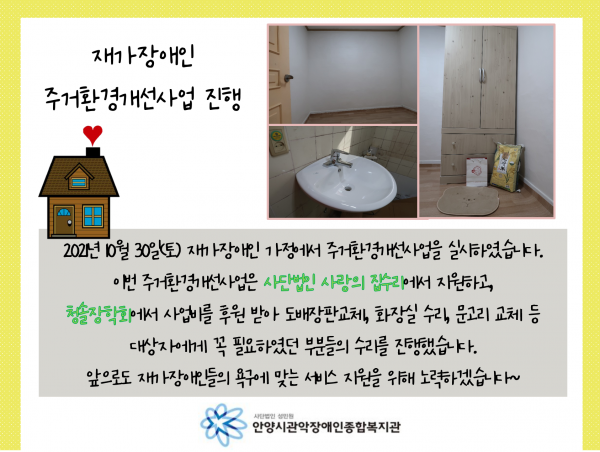 목록 재가장애인 주거환경개선사업 진행 페이지 정보 운영자 조회 1,159 입력 2021-11-02 13:26 댓글 0 본문 목록 이전글1차 자원봉사자 간담회 2021.11.04 다음글♥ 너랑 나랑 ♥ 형제자매 관계 개선 프로그램 2차 프로그램 미술치료, 부모교육. 2021.11.02 댓글 0 댓글목록 등록된 댓글이 없습니다.