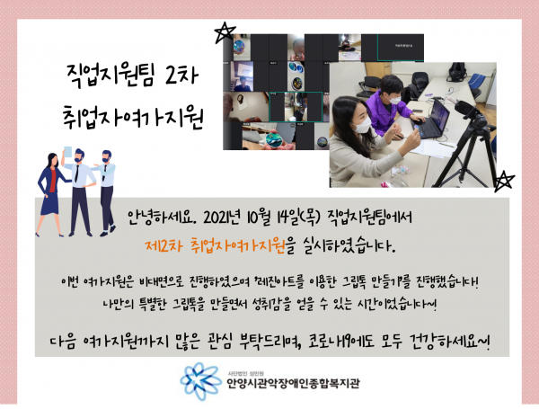 목록 직업지원팀 제2차 취업자 여가지원 페이지 정보 운영자 조회 1,390 입력 2021-10-20 09:50 댓글 0 본문 목록 이전글만안청소년수련관 학생동아리 축제 체험키트 만들기 2021.10.20 다음글직업지원팀 ‘밴드운동’ 영상 업로드 2021.10.20 댓글 0 댓글목록 등록된 댓글이 없습니다.