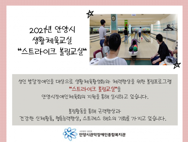 목록 2021년 안양시 생활체육교실 “스트라이크 볼링교실” 페이지 정보 운영자 조회 1,302 입력 2021-10-05 14:16 댓글 0 본문 목록 이전글「2021년 경기도 발달장애인 평생교육 추천 콘텐츠 공모전」입상 2021.10.05 다음글이웃만들기 5차- 레인보우 초코 퐁듀 2021.09.30 댓글 0 댓글목록 등록된 댓글이 없습니다.