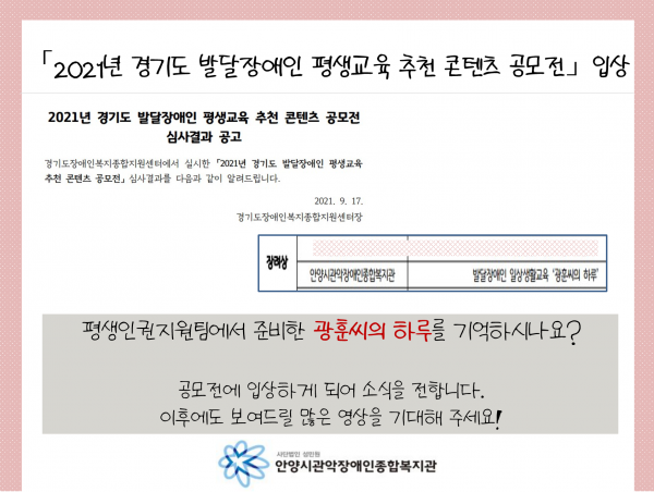목록 「2021년 경기도 발달장애인 평생교육 추천 콘텐츠 공모전」입상 페이지 정보 운영자 조회 1,298 입력 2021-10-05 16:02 댓글 0 본문 목록 이전글제 2차 취업자 간담회 2021.10.06 다음글2021년 안양시 생활체육교실 “스트라이크 볼링교실” 2021.10.05 댓글 0 댓글목록 등록된 댓글이 없습니다.