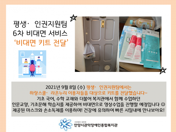 목록 평생인권지원팀 6차 비대면 서비스 비대면 키트 전달 페이지 정보 운영자 조회 1,353 입력 2021-09-10 10:57 댓글 0 본문 목록 이전글제22회 사회복지의 날 기념 안양시사회복지협의회장상 수상(안양시관악장애인주간보호센터) 2021.09.13 다음글3분기 고충처리위원회의 2021.09.10 댓글 0 댓글목록 등록된 댓글이 없습니다.