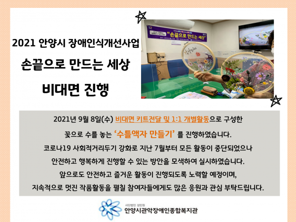목록 안양시장애인식개선사업 손끝으로만드는세상 비대면 실시 페이지 정보 운영자 조회 1,328 입력 2021-09-14 13:25 댓글 0 본문 목록 이전글평생인권지원팀 7차 비대면 서비스 ‘zoom영상수업’ 2021.09.16 다음글제22회 사회복지의 날 기념 안양시사회복지협의회장상 수상(안양시관악장애인주간보호센터) 2021.09.13 댓글 0 댓글목록 등록된 댓글이 없습니다.