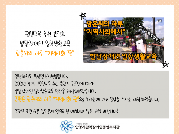 목록 평생교육 추천 콘텐츠 발달장애인 일상생활교육 "광훈씨의 하루 2편" 페이지 정보 운영자 조회 1,455 입력 2021-09-01 16:05 댓글 0 본문 목록 이전글CCTV 설치 설명회 2021.09.02 다음글직업지원팀 나도 바리스타 2탄 업로드 2021.09.01 댓글 0 댓글목록 등록된 댓글이 없습니다.