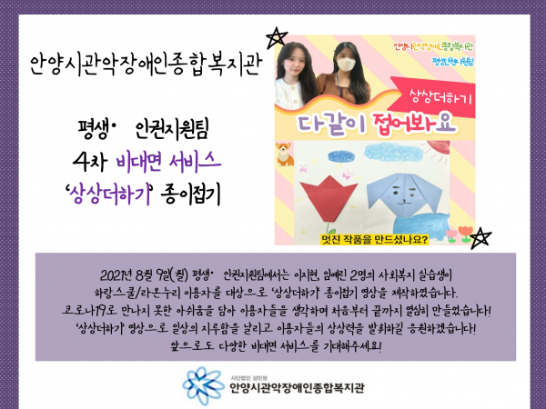 목록 평생인권지원팀 4차 비대면서비스 '상상더하기!' 페이지 정보 운영자 조회 1,682 입력 2021-08-09 13:32 댓글 0 본문 유투브 시청하기 https://youtu.be/eXrEQMbgSTQ 목록 이전글안양시장애인인식개선사업 ‘관악정원의 품격’ 7월 이야기 2021.08.12 다음글경기도(안양시) 슐런 대표 선발전 2021.08.06 댓글 0 댓글목록 등록된 댓글이 없습니다.