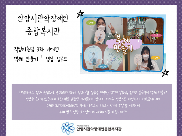 목록 직업지원팀 실습생과 함께하는 '부채만들기' 페이지 정보 운영자 조회 1,721 입력 2021-08-13 11:50 댓글 0 본문 유튜브 링크 : https://youtu.be/qTKfKlet0HQ많은 시청부탁드립니다 :-) 목록 이전글2021년도 하계 사회복지/직업재활 실습 종결평가회 2021.08.17 다음글안양시장애인인식개선사업 ‘관악정원의 품격’ 7월 이야기 2021.08.12 댓글 0 댓글목록 등록된 댓글이 없습니다.