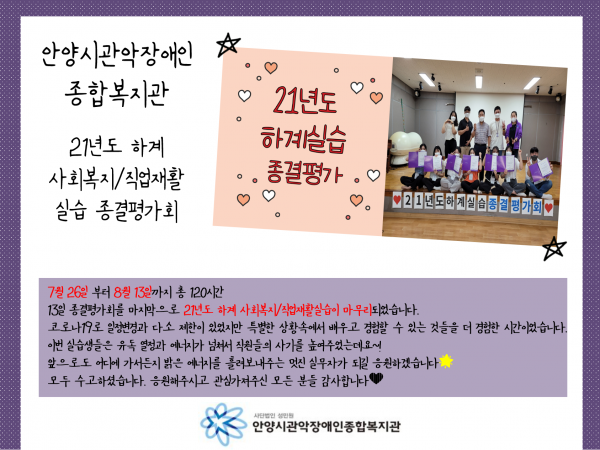 목록 2021년도 하계 사회복지/직업재활 실습 종결평가회 페이지 정보 운영자 조회 1,569 입력 2021-08-17 10:57 댓글 0 본문 목록 이전글직업지원팀 훈련생 3차 비대면 서비스 키트 전달 2021.08.18 다음글직업지원팀 실습생과 함께하는 '부채만들기' 2021.08.13 댓글 0 댓글목록 등록된 댓글이 없습니다.