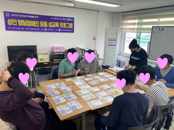 성인 발달장애인을 대상으로 2021년 4월부터 10월까지 매월 2회씩 올바른 성 지식에 대한 인식제고와 실제적인 성폭력 대응방법에 대해서 교육을 실시하고 있습니다.