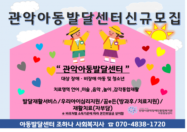 목록 관악아동발달센터 이용자모집 안내 페이지 정보 운영자 조회 1,550 입력 2021-03-19 18:14 댓글 0 본문 목록 이전글경기도장애인복지종합지원센터(누림센터) 협력지원팀 기관방문 2021.03.22 다음글안양시 민선7기 공약사업 "안양시 『장애아동특수치료사 지원사업』 2021.03.19 댓글 0 댓글목록 등록된 댓글이 없습니다.