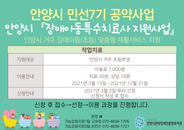 목록 안양시 「장애아동 특수치료사 지원사업」 이용자 모집 페이지 정보 운영자 조회 1,568 입력 2021-02-18 13:13 댓글 0 본문 목록 이전글2021년 2월 부모월례회의 2021.02.19 다음글2020 동계실습 종결평가회 진행 2021.02.17 댓글 0 댓글목록 등록된 댓글이 없습니다.