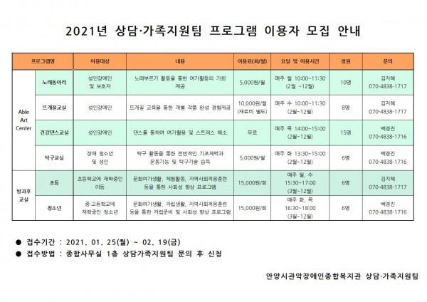 목록 상담가족지원팀 프로그램 이용자 모집 페이지 정보 운영자 조회 1,590 입력 2021-01-27 17:08 댓글 0 본문 상담가족지원팀에서는 2021년 프로그램 이용자를 위와 같이 모집하오니 많은 참여 부탁드립니다. 문의 : 상담가족지원팀 070-4838-1716/1717 목록 이전글D마켓이 1월 28일부터 진행됩니다! 2021.01.27 다음글2021년 사회복지/직업재활 동계실습 진행 2021.01.26 댓글 0 댓글목록 등록된 댓글이 없습니다.