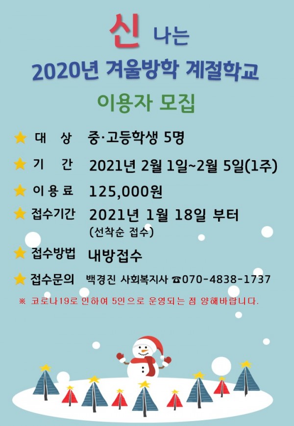 목록 2020 겨울방학 계절학교 이용자 모집 페이지 정보 운영자 조회 1,601 입력 2021-01-15 17:54 댓글 0 본문 상담가족지원팀에서는 2020년 겨울방학 계절학교 이용자를 모집하오니 많은 참여 부탁드립니다.※ 코로나19로 인하여 5인으로 운영되는점 양해바랍니다. 목록 이전글2021년 발달장애인 생활일자리사업 업무협약 2021.01.20 다음글2021년 시무식 및 1차 직원융합회의 2021.01.08 댓글 0 댓글목록 등록된 댓글이 없습니다.