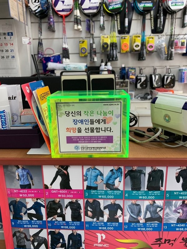 지역사회에서 나눔을 실천하는 모금함 업체 '케이엔비스포츠 요넥스 안양점'에 많이 방문해 주세요!