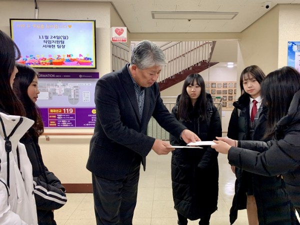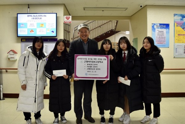11월 21일(목) 근명여자정보고등학교의 3개 동아리(근명바리스타반, 봉제인형반, 러브퀼트)에서 각각 모금한 후원금을 가지고 우리 복지관에 방문해 주셨습니다.
