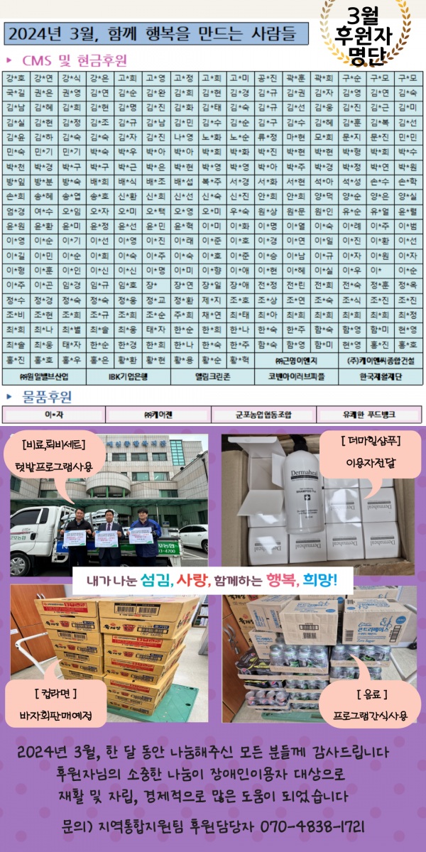 목록 2024년 3월 후원이야기 페이지 정보 이재인 조회 611 입력 2024-04-11 15:06 댓글 0 본문 후원자님의 이름이 누락되었거나, 정보가 변경되었을 시 꼭 알려주세요! 후원해주신 성금과 물품을 투명하고 공정하게 사용하여 도움이 필요한 분들에게 희망이 될 수 있도록 노력하겠습니다.진심으로 감사드립니다.(지역통합지원팀 후원담당자 070-4838-1721) 목록 이전글2024년 4월 후원이야기 2024.05.08 다음글2024년 2월 후원이야기 2024.03.12 댓글 0 댓글목록 등록된 댓글이 없습니다.