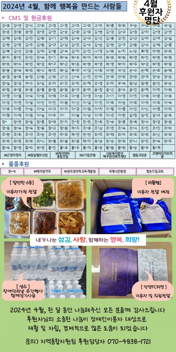 목록 2024년 4월 후원이야기 페이지 정보 이재인 조회 595 입력 2024-05-08 16:02 댓글 0 본문 후원자님의 이름이 누락되었거나, 정보가 변경되었을 시 꼭 알려주세요! 후원해주신 성금과 물품을 투명하고 공정하게 사용하여 도움이 필요한 분들에게 희망이 될 수 있도록 노력하겠습니다.진심으로 감사드립니다.(지역통합지원팀 후원담당자 070-4838-1721) 목록 이전글2024년 5월 후원이야기 2024.06.20 다음글2024년 3월 후원이야기 2024.04.11 댓글 0 댓글목록 등록된 댓글이 없습니다.