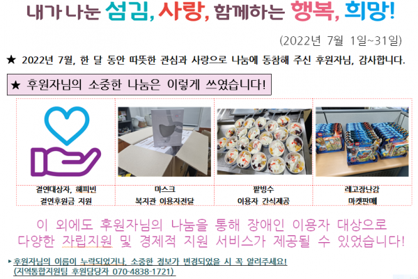 목록 2022년 7월 후원이야기 페이지 정보 이재인 조회 762 입력 2022-08-05 14:42 댓글 0 본문 목록 이전글2022년 8월 후원이야기 2022.08.30 다음글아낌없이 주는 나무 후원회와 함께하는 팥빙수 나눔행사 2022.08.04 댓글 0 댓글목록 등록된 댓글이 없습니다.