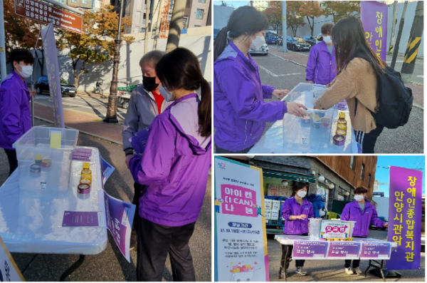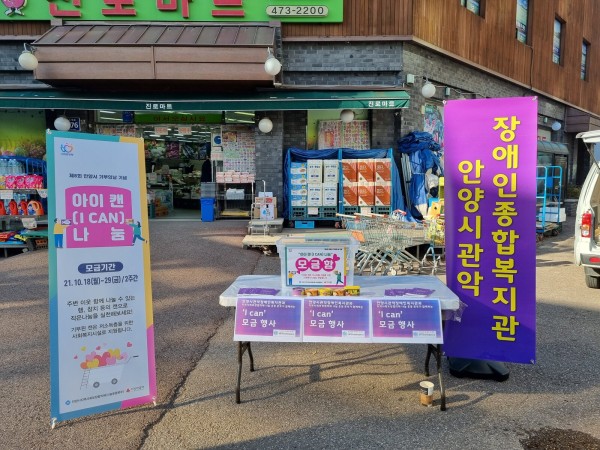 2021년 10월 27일(수) 안양시관악장애인종합복지관에서는 예술공원 입구 진로마트와 협의하여 아이 캔(I CAN) 모금행사를 진행하였습니다.