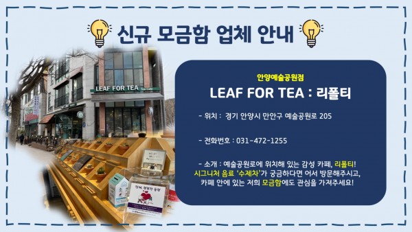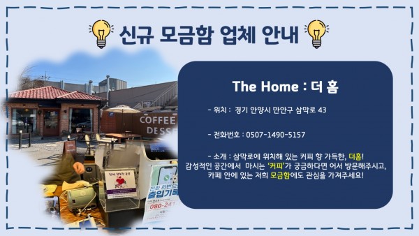 목록 신규 모금함 비치 업체 안내 -더홈카페, 리폴티카페 페이지 정보 이재인 조회 1,042 입력 2022-02-08 15:38 댓글 0 본문 목록 이전글신규 모금함 비치 업체 안내 -착한낙지, 본가장수촌(음식점) 2022.02.08 다음글2021년 12월 후원이야기 2022.01.18 댓글 0 댓글목록 등록된 댓글이 없습니다.