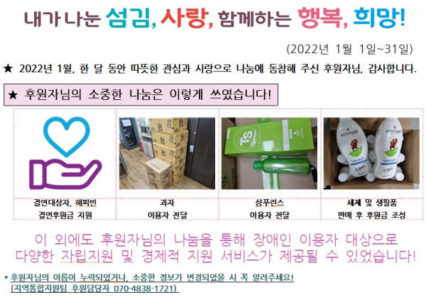 목록 2022년 1월 후원이야기 페이지 정보 이재인 조회 866 입력 2022-02-10 13:25 댓글 0 본문 목록 이전글2022년 2월 후원이야기 2022.03.04 다음글신규 모금함 비치 업체 안내 -착한낙지, 본가장수촌(음식점) 2022.02.08 댓글 0 댓글목록 등록된 댓글이 없습니다.