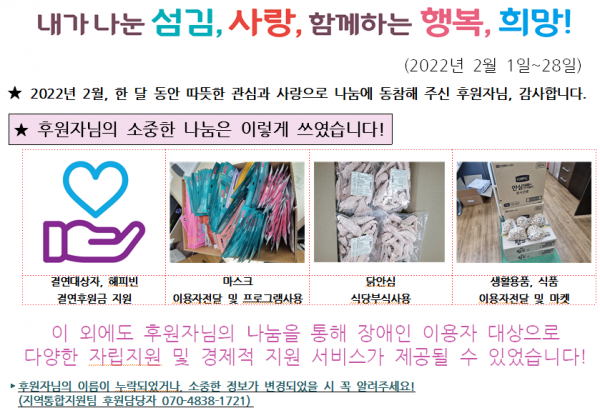 목록 2022년 2월 후원이야기 페이지 정보 이재인 조회 869 입력 2022-03-04 10:50 댓글 0 본문 목록 이전글신규 모금함 비치 업체 안내 -나리테이블, 황태섭 자연베이커리 2022.03.24 다음글2022년 1월 후원이야기 2022.02.10 댓글 0 댓글목록 등록된 댓글이 없습니다.
