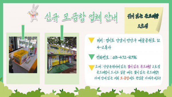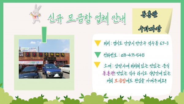 목록 신규 모금함 비치 업체 안내 -동흥관 수타짜장, 꽃이있는곤드레밥 페이지 정보 이재인 조회 1,121 입력 2021-08-17 13:37 댓글 0 본문 목록 이전글안양시관악장애인종합복지관 모금함 비치 업체 안내 2021.08.19 다음글2021년 7월 후원이야기 2021.08.17 댓글 0 댓글목록 등록된 댓글이 없습니다.