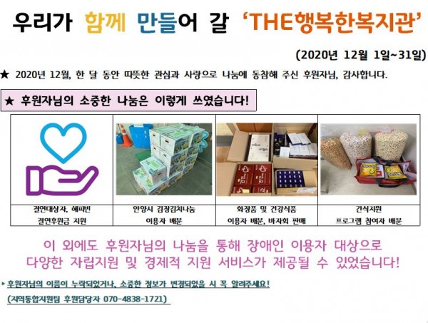 목록 12월 후원이야기 페이지 정보 운영자 조회 1,197 입력 2021-01-08 15:32 댓글 0 본문 목록 이전글안양시관악장애인종합복지관 모금함 비치 업체 모집 2021.01.29 다음글아낌없이 주는 나무 후원회 후원품 전달 2021.01.08 댓글 0 댓글목록 등록된 댓글이 없습니다.