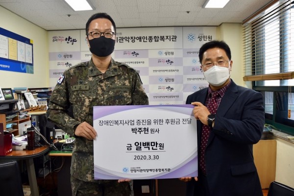 2020년 3월 30일(월), 안양시관악장애인종합복지관에서 제51보병사단 박주현 원사의 후원금 전달식이 진행되었다.