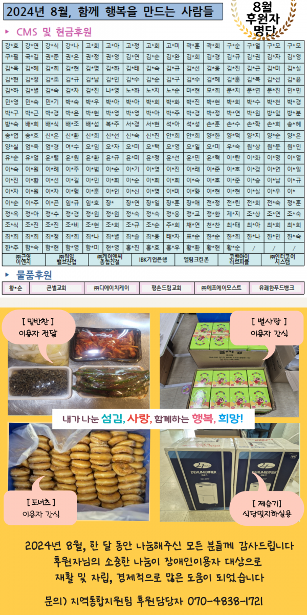 목록 2024년 8월 후원이야기 페이지 정보 이재인 조회 376 입력 2024-09-24 13:15 댓글 0 본문 후원자님의 이름이 누락되었거나, 정보가 변경되었을 시 꼭 알려주세요! 후원해주신 성금과 물품을 투명하고 공정하게 사용하여 도움이 필요한 분들에게 희망이 될 수 있도록 노력하겠습니다.진심으로 감사드립니다.(지역통합지원팀 후원담당자 070-4838-1721) 목록 이전글2024년 9월 후원이야기 2024.12.09 다음글2024년 7월 후원이야기 2024.08.09 댓글 0 댓글목록 등록된 댓글이 없습니다.
