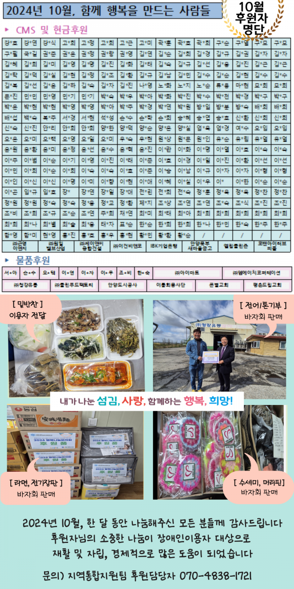 목록 2024년 10월 후원이야기 페이지 정보 이재인 조회 114 입력 2024-12-09 15:18 댓글 0 본문 후원자님의 이름이 누락되었거나, 정보가 변경되었을 시 꼭 알려주세요! 후원해주신 성금과 물품을 투명하고 공정하게 사용하여 도움이 필요한 분들에게 희망이 될 수 있도록 노력하겠습니다.진심으로 감사드립니다.(지역통합지원팀 후원담당자 070-4838-1721) 목록 이전글2024년 11월 후원이야기 2024.12.11 다음글2024년 9월 후원이야기 2024.12.09 댓글 0 댓글목록 등록된 댓글이 없습니다.