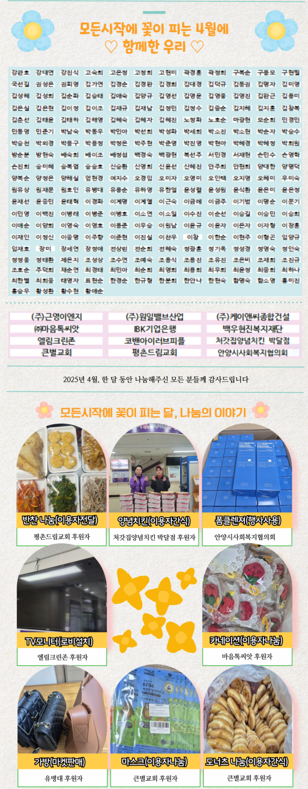 목록 2025년 4월 후원이야기 페이지 정보 이재인 조회 40 입력 2025-05-13 14:01 댓글 0 본문 후원자님의 이름이 누락되었거나, 정보가 변경되었을 시 꼭 알려주세요! 후원해주신 성금과 물품을 투명하고 공정하게 사용하여 도움이 필요한 분들에게 희망이 될 수 있도록 노력하겠습니다.진심으로 감사드립니다.(지역통합지원팀 후원담당자 070-4838-1721) 목록 이전글2025년 5월 후원이야기 2025.06.16 다음글2025년 3월 후원이야기 2025.04.08 댓글 0 댓글목록 등록된 댓글이 없습니다.