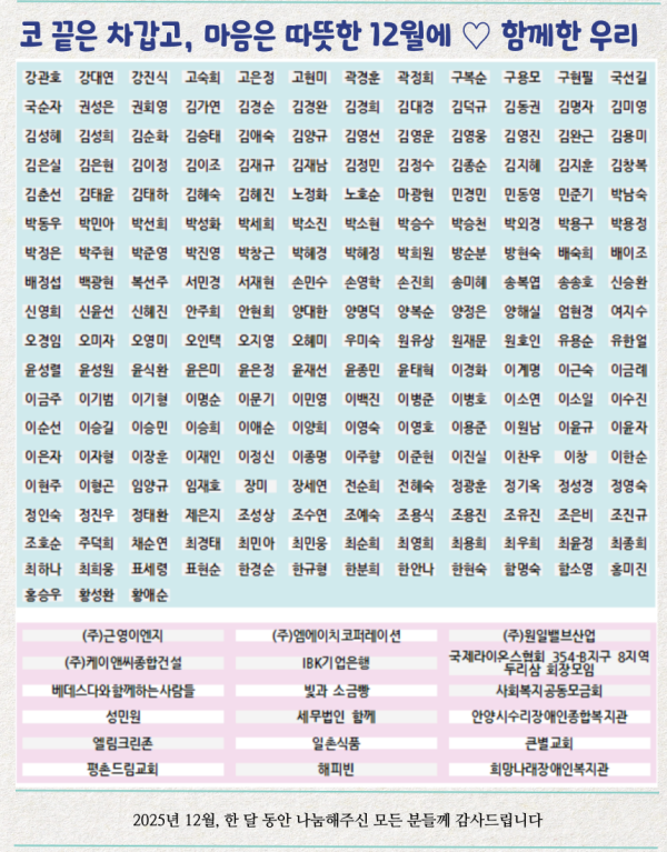 목록 2025년 12월 후원이야기 페이지 정보 이재인 조회 62 입력 2026-02-11 16:52 댓글 0 본문 후원자님의 이름이 누락되었거나, 정보가 변경되었을 시 꼭 알려주세요! 후원해주신 성금과 물품을 투명하고 공정하게 사용하여 도움이 필요한 분들에게 희망이 될 수 있도록 노력하겠습니다.진심으로 감사드립니다.(지역통합지원팀 후원담당자 070-4838-1721) 목록 이전글2026년 1월 후원이야기 2026.02.12 다음글2025년 11월 후원이야기 2026.02.11 댓글 0 댓글목록 등록된 댓글이 없습니다.