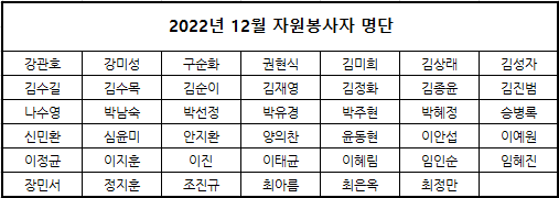 목록 2022년 12월 자원봉사자 명단 페이지 정보 정태환 조회 683 입력 2023-01-05 16:12 댓글 0 본문 안녕하세요. 안양시관악장애인종합복지관입니다.12월 달에도 많은 자원봉사자분들께서 저희 복지관을 위해 봉사활동을 해주셨습니다. 12월 한 달 저희 복지관에 와 주신 자원봉사자 41분께 감사의 말씁을 드리며,다음에 뵙겠습니다. 목록 이전글2023년 1월 자원봉사자 명단 2023.03.02 다음글2022년 11월 자원봉사자 명단 2023.01.05 댓글 0 댓글목록 등록된 댓글이 없습니다.