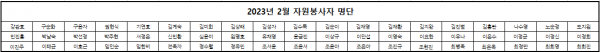 목록 2023년 2월 자원봉사자 명단 페이지 정보 정태환 조회 684 입력 2023-03-02 15:42 댓글 0 본문 안녕하세요. 안양시관악장애인종합복지관입니다.1월 달에 이어 2월 달에도 많은 자원봉사자분들께서 저희 복지관을 위해 봉사활동을 해주셨습니다. 2월 한 달 저희 복지관에 와 주신 자원봉사자 57분께 감사의 말씀을 드리며,다음에 뵙겠습니다. 목록 이전글2023년 10월 자원봉사자 명단 2023.11.14 다음글2023년 1월 자원봉사자 명단 2023.03.02 댓글 0 댓글목록 등록된 댓글이 없습니다.
