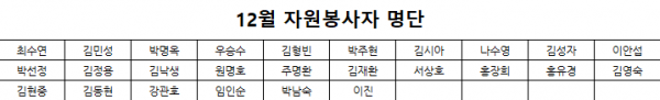 목록 2021년 12월 자원봉사 명단 페이지 정보 운영자 조회 834 입력 2022-01-21 14:25 댓글 0 본문 한 해를 마무리하는 12월입니다. 추운 날씨에서도 고생해주신 자원봉사자분들께 감사의 말씀을 전합니다.2022년 새해 복 많이 받으세요^^ 목록 이전글2022년 1월 정기자원봉사단 홍보 2022.02.10 다음글2021년 11월 자원봉사 명단 2022.01.21 댓글 0 댓글목록 등록된 댓글이 없습니다.