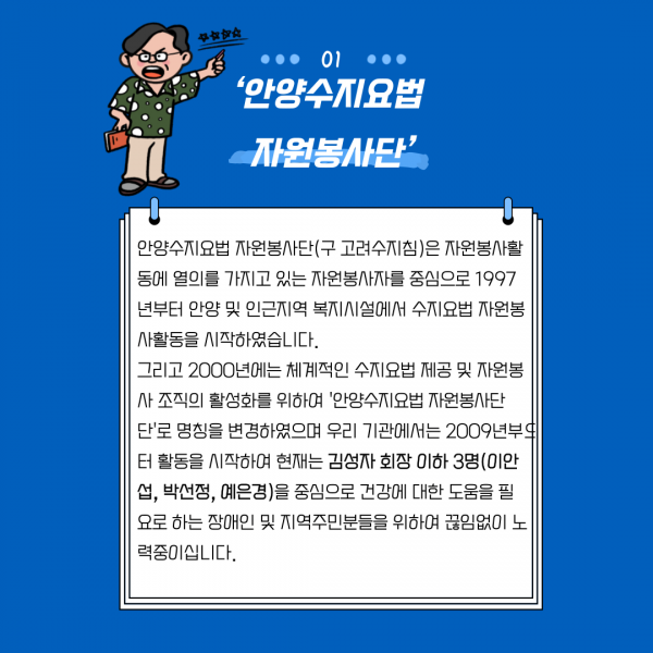 목록 2022년 1월 정기자원봉사단 홍보 페이지 정보 운영자 조회 841 입력 2022-02-10 10:44 댓글 0 본문 안녕하세요. 안양시관악장애인종합복지관 자원봉사담당 이정기 사회복지사입니다.올해부터는 매달 정기자원봉사단을 소개해드리고자합니다.많은 관심 부탁드리며 문의사항이 있으신분들께서는 070-4838-1737로 전화 부탁드리겠습니다! 목록 이전글2022년 1월 자원봉사자 명단 2022.02.10 다음글2021년 12월 자원봉사 명단 2022.01.21 댓글 0 댓글목록 등록된 댓글이 없습니다.