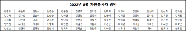 목록 2022년 8월 자원봉사자 명단 페이지 정보 정태환 조회 798 입력 2022-09-05 14:54 댓글 0 본문 안녕하세요. 안양시관악장애인종합복지관입니다.8월 달에도 많은 자원봉사자분들께서 저희 복지관을 위해 봉사활동을 해주셨습니다. 변덕스러운 여름 날씨에도 불구하고 와 주신 자원봉사자 65분께 감사의 말씁을 드리며,태풍 조심하시고 다음에도 뵙겠습니다. 목록 이전글2022년 9월 자원봉사자 명단 2023.01.05 다음글2022년 7월 자원봉사자 명단 2022.08.05 댓글 0 댓글목록 등록된 댓글이 없습니다.