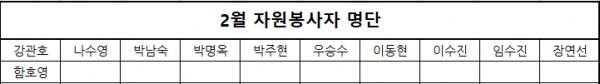 목록 2021년 2월 자원봉사자 명단 페이지 정보 장재석 조회 1,290 입력 2021-02-26 15:48 댓글 0 본문 코로나바이러스감염증-19(COVID-19)로 인해 국가적 재난상황이라는사상 초유의 일을 겪고 있는 중에도 사랑과 나눔의 손길을 보내주신,자원봉사자님께 감사의 마음을 전합니다. 2021년 2월 자원봉사자분들은 5인미만 프로그램에서 활동하였습니다. 목록 이전글2021년 3월 자원봉사자 명단 2021.04.01 다음글2021년 1월 자원봉사자 명단 2021.01.29 댓글 0 댓글목록 등록된 댓글이 없습니다.